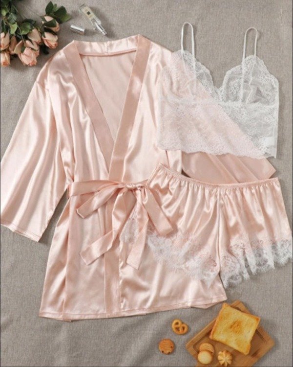 Pijama raso liso . Top encaje + short +bata