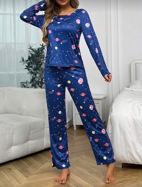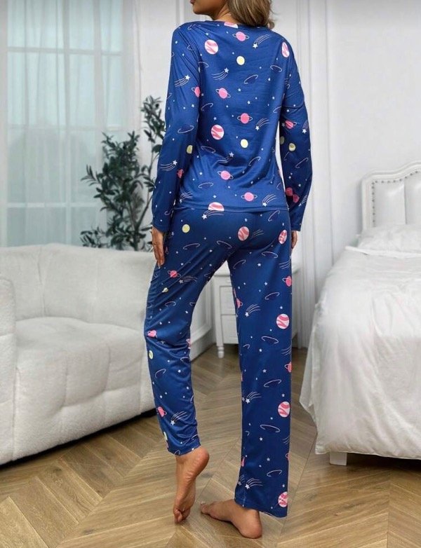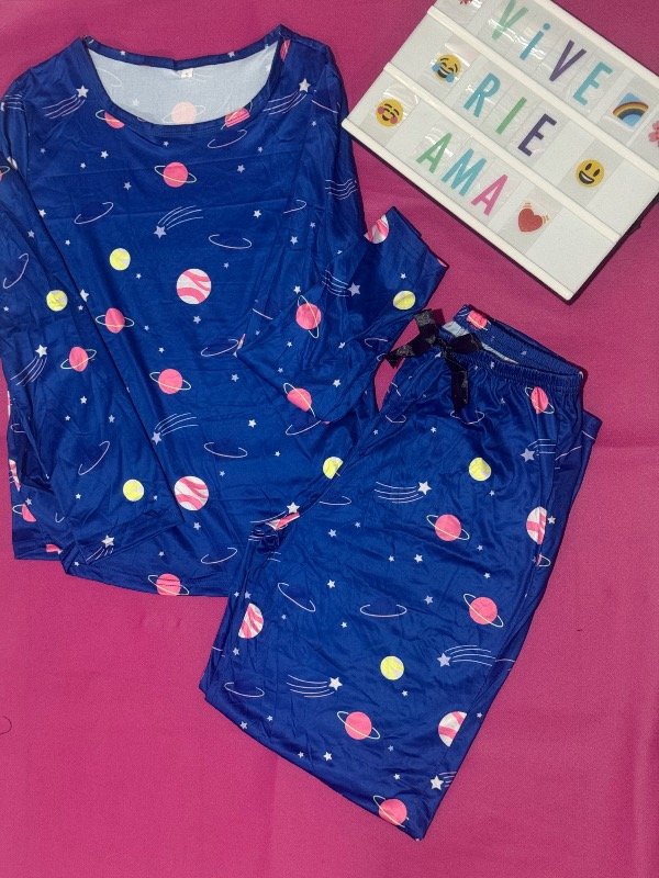 Pijama manga larga . Estampado galaxia . Tela súper suave . Liviana y calentita a la vez . Ideal para estar en casa cómoda y con estilo .